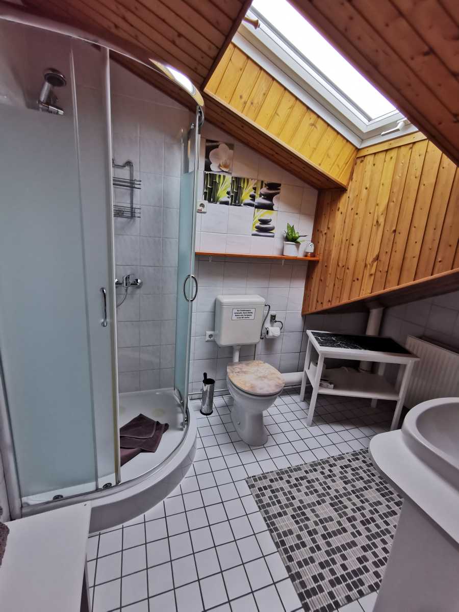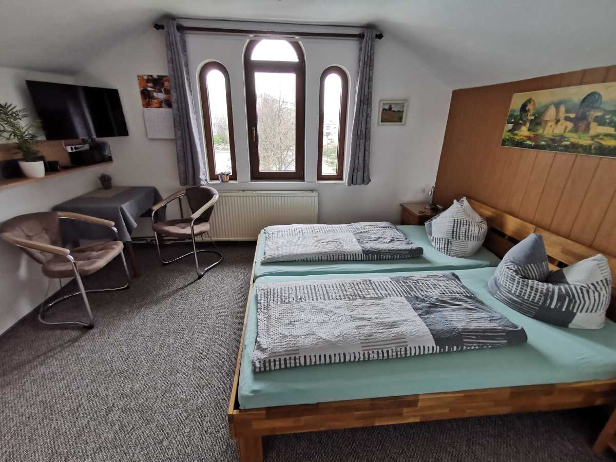 Unser Doppelzimmer 1 ist mit einem Doppelbett, bzw. zwei getrennten Betten, einen Tisch sowie einer Sitzgelegenheit eingerichtet. Ein TV und Radio sind ebenfalls vorhanden. Dusche und WC befinden sich im Zimmer.